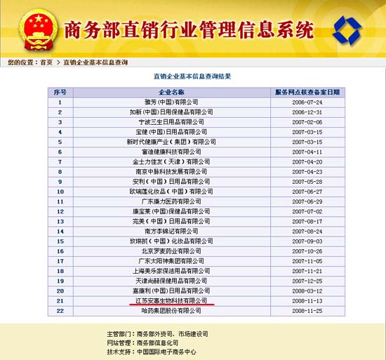 2008年11月13日,從商務部直銷行業(yè)管理信息系統(tǒng)傳出信息:江蘇安惠生物科技有限公司獲得中華人民共和國直銷經營許可,并已完成服務網點核查備案。安惠公司將依法在獲得批準的直銷區(qū)域開展直銷經營活動。
