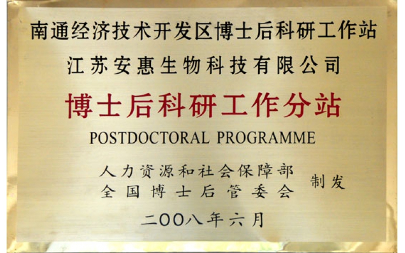 2008年10月15日,安惠公司接受國家人力資源部、社會保障局、全國博士后管委會聯合制發(fā)的“博士后科研工作分站”銅牌。