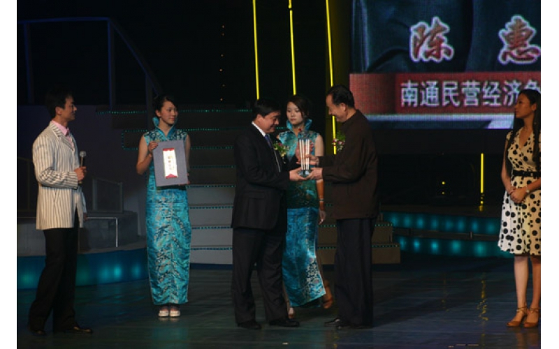 2007年3月30日,南通更俗劇院。南通民營經濟爭創“名企、名品、名人”2006年度人物頒獎晚會隆重舉行。會上,通過初評、公眾投票、專家組評定等程序評選出的12位民營企業家受到表彰,陳惠董事長榮列其中。南通市政協主席曹能新為陳惠董事長頒發榮譽證書和獎杯。